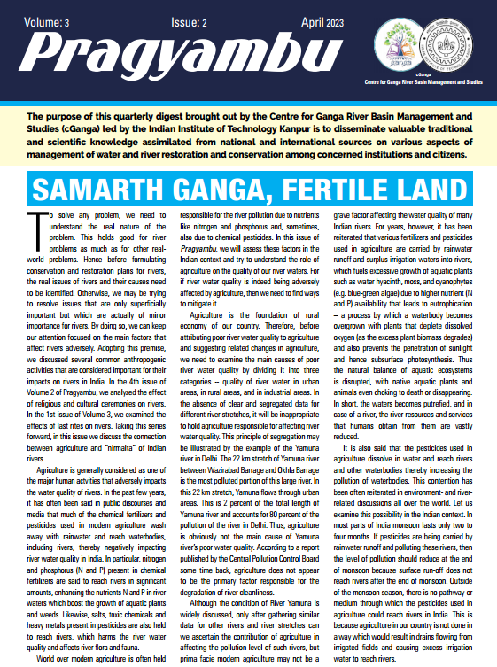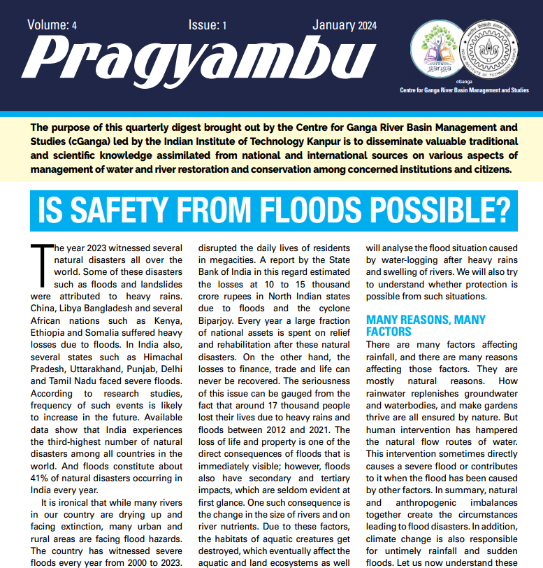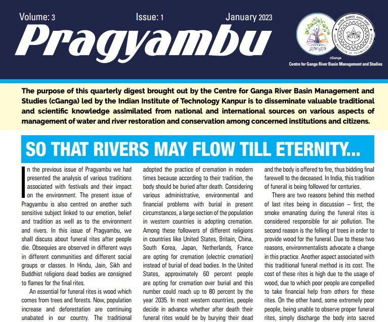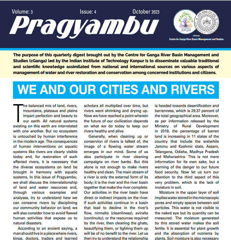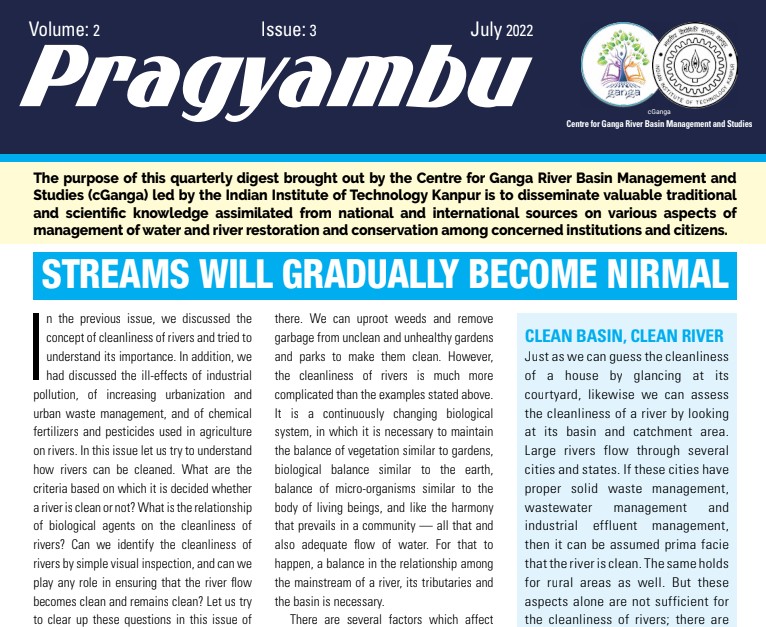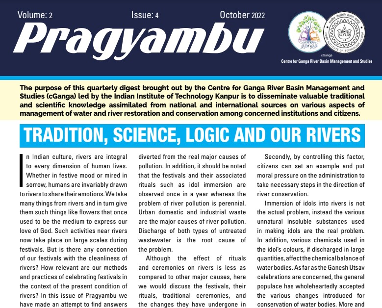 The purpose of this quarterly digest brought out by the Centre of Ganga River Basin Management and studies (cGanga) lead by the IIT Kanpur is to disseminate valuable traditional and scientific knowledge assimilated from national and international sources on various aspects of management of water and river restoration and conservation among concerned institutions and citizens.